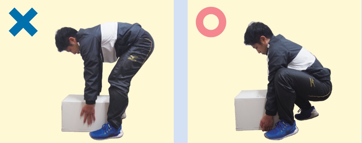 重い物を持ち上げるときも注意。持ち上げ方によっては腰に大きな負担がかかってしまいます。膝を曲げ、腰をしっかり落として下半身の筋肉を使って持ち上げましょう。