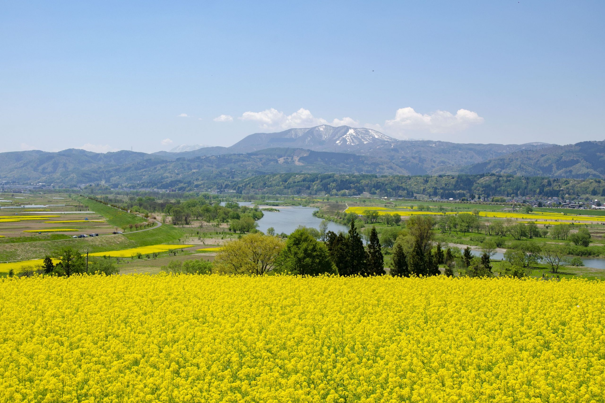 一方、スキーシーズン以外も、豊かな自然を楽しめるアクティビティや観光スポット、イベントが充実している。例えばJR飯山駅を中心とした市街地の北東部にある菜の花公園は、千曲川沿いの小高い丘の上の絶景スポットに位置し、例年4月下旬から5月上旬にかけて一面に菜の花が咲き誇る。この時期に合わせて毎年5月3日、4日、5日に開催される「いいやま菜の花まつり」は、飯山市の大人気イベントだ。