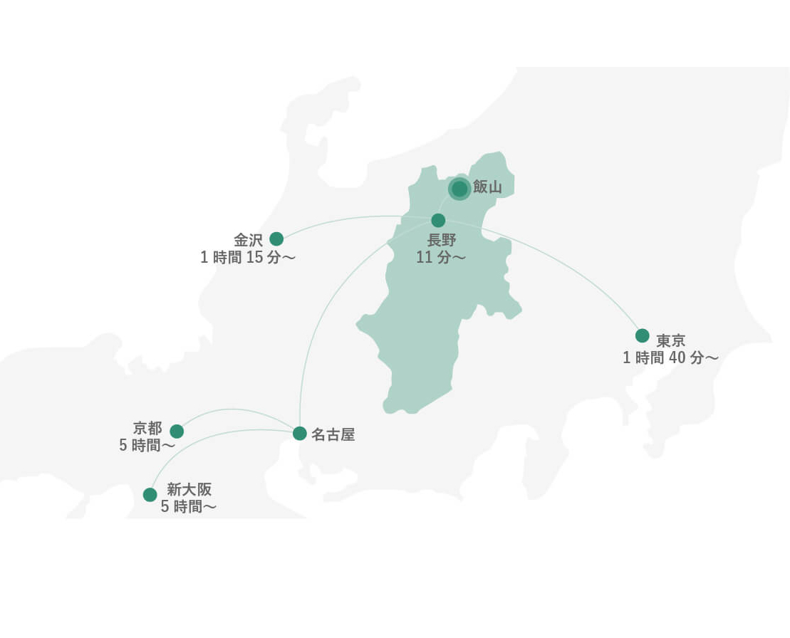 飯山市は、長野県内で最も低い千曲川沖積地に広がる飯山盆地を中心に、西に関田山脈・東に三国山脈が走る南北に長い地形をもっており、南西部には斑尾高原、北西部には鍋倉山、東部には北竜湖などがあり、多くの自然資源に恵まれた地となっています。近傍都市への距離は、長野市へ36㎞、中野市へ15㎞、新潟県妙高市へは25㎞となっています。